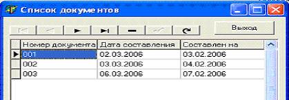 Форма «Список документов» служит для отображения всех сохраненных ранее меню. Выбрав какой либо документ, на главной форме в сетке DBGrid автоматически отображается его описание. Для перемещения по записям на форме присутствует DBNavigator. Удаление, сохранение и редактирование документов осуществляется так же через DBNavigator.