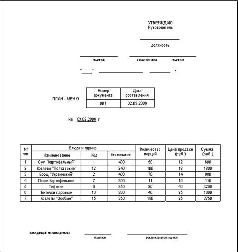- Отчет о составленном плане меню для кухни;