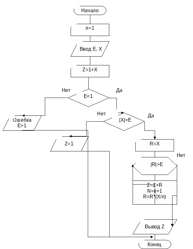 Вычисления закончить, когда модуль последнего просуммированного члена ряда станет меньше Е.