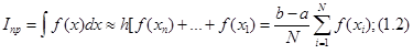 Найпростішим методом наближеного обчислення інтеграла є метод прямокутників, геометрична інтерпретація якого зводиться до знаходження визначеного інтегралу як суми площ N прямокутників (з висотою f(x) та основою