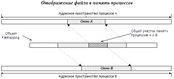 Не втором этапе процесс вызывает функцию MapViewOfFile, передавая ей как параметры хэндл объекта «отображение файла», а также размер участка файла, который должен быть отображен, и смещение начала этого участка от начала файла.