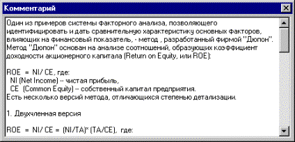 Каждая аналитическая таблица в Audit Expert снабжена специальным комментарием, где содержатся краткие сведения об используемой методике, допустимые значения показателей и другая информация. Текст комментария можно редактировать и включать вместе с аналитическими таблицами в итоговый отчет.