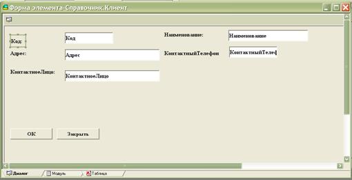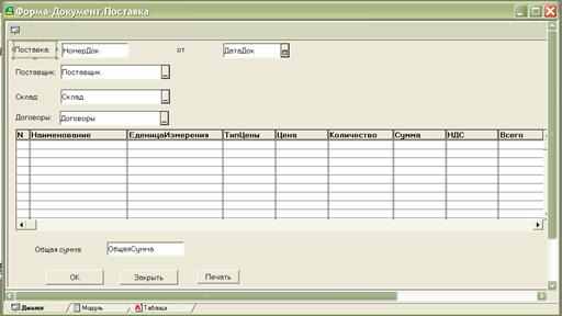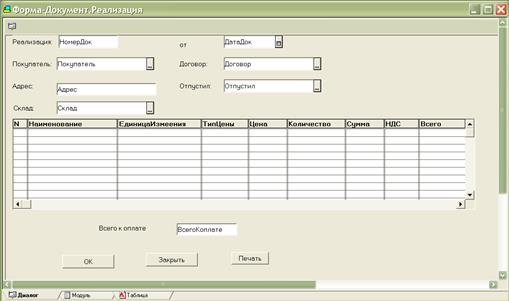 Создание диалоговой формы документа «Реализация» происходит с помощью редактора форм, который загружается автоматически при выборе в окне редактирования кнопки «Форма». Размещение реквизитов документа происходит на закладке «Диалог». При этом реквизиты «НомерДок» и «ДатаДок» вводятся системой автоматически. Колонка «ТипЦены» табличной части формы имеет формулу:
