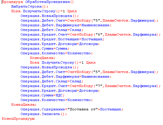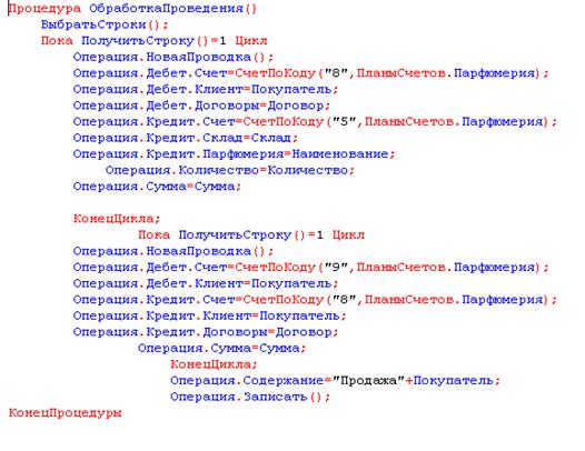 Формирование проводок происходит с помощью предопределенной процедуры ОбработкаПроведения(). Документ «Реализация» по каждой строчке табличной части формирует проводку: Дт 8– Кт 5.