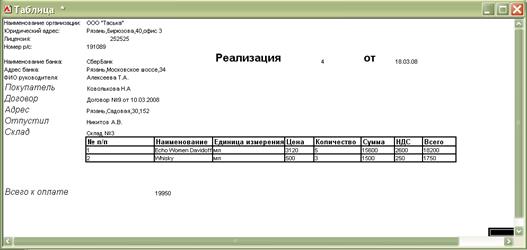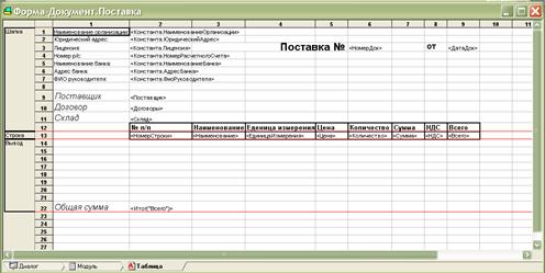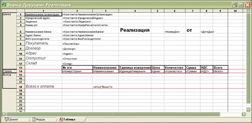 Создание печатной формы документа «Реализация» происходит в ручную. Размещение реквизитов печатной формы происходит на закладке «Таблица». Затем некоторые части печатной формы документа заключаются в секции. Печатная форма документа представлена в Приложении П.
