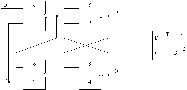 Тактовий D-тригер. Він має інформаційний вихід і вхід синхронізації. Одна із можливих структурних схем однотактного D-тригера і його умовне позначення наведені на рисунку 5.