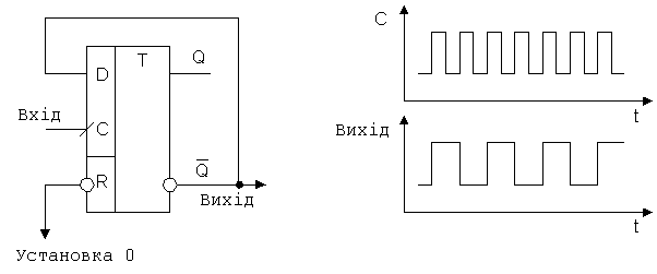 Лічильний Т-тригер (рисунок 6). Його називають також тригером зі лічильним входом. Він має один вхід керування Т і два виходи Q і Q' . Інформація на виході такого тригера змінює свій знак на протилежний при кожному позитивному (або при кожному негативному) перепаді напруги на вході. В серії мікросхем, що випускаються, Т-тригерів, як правило, немає. Але тригер такого типу може бути створений на базі тактового D-тригера, якщо його інверсний вихід з'єднати з інформаційним входом. Як видно з діаграми, частота сигналу на виході Т-тригера в два разу нижче частоти сигналу на вході, тому такий тригер можна використовувати як подільник частоти і двійковий лічильник.