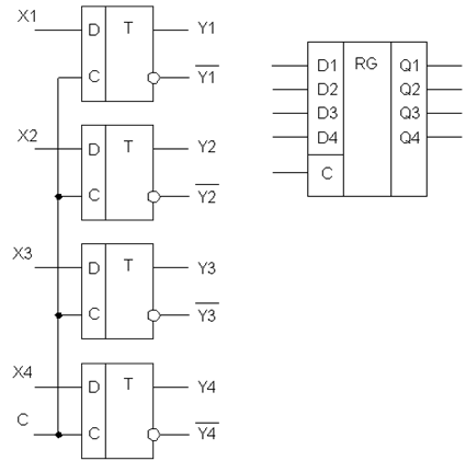 В паралельному регістрі на тактових D-тригерах (рисунок 8) код числа, що запам‘ятовується, подається на інформаційні входи всіх тригерів і записується в регістр з приходом тактового імпульсу. Вихідна інформація змінюється з подачею нового вхідного слова і приходом наступного імпульсу запису. Такі регістри використовують в системах оперативної пам'яті. Число тригерів в них дорівнює максимальній розрядності слів, що зберігаються у ньому.