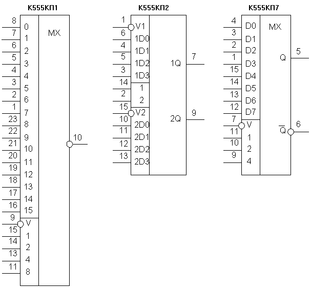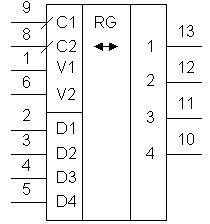 Дуже зручні універсальні регістри, що дозволять здійснювати як послідовний, так і паралельний запис і зчитування. Такі регістри можна використовувати як перетворювачі паралельного коду в послідовний і навпаки. Наприклад, мікросхема К555ИР1 (рисунок 10) - чотирирозрядний універсальний зсувний регістр. Регістр працює в режимі зсуву по тактових імпульсах, що надходять на вхід С1, якщо на вході V2 є напруга низького рівня. Вхід V1 служить для введення інформації в перший розряд регістра в цьому режимі. Якщо ж на вході V2 напруга високого рівня, то регістр здійснює паралельний запис інформації із входів D1-D4 по імпульсах синхронізації, що надходять на вхід С2.