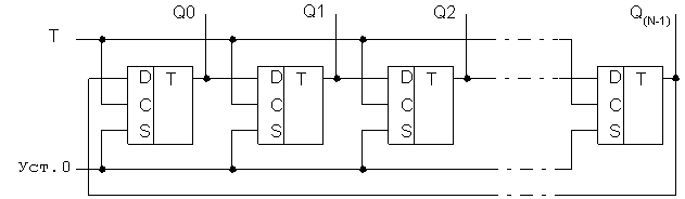 Регістр зсуву можна перетворити в кільцевий лічильник, якщо вихід останнього тригера з'єднати з входом D першого. Схема такого лічильника на N розрядів наведена на рисунку 11. Перед початком підрахунку імпульсом початкової установки в нульовий розряд лічильника (Q0) записується логічна 1, в інші розряди — логічні 0. З початком рахунку кожний з лічильних імпульсів Т, що приходять, перезаписує 1 в наступний тригер, і число імпульсів, що надійшли, визначається за номером виходу, на якому є 1. Передостанній (N-1) імпульс переведе в одиничний стан останній тригер, а N-ний імпульс перенесе цей стан на вихід нульового тригера, і підрахунок розпочнеться спочатку. Таким чином, можна побудувати кільцевий лічильник з довільним коефіцієнтом перерахунку (будь-якою основою числення), змінюючи лише число тригерів в ланцюжку.