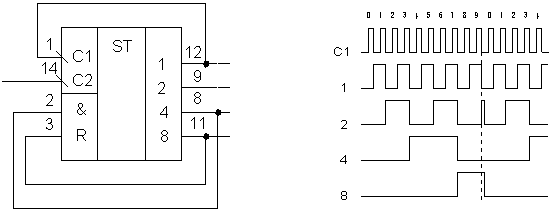 Недолік такого лічильника - велике число тригерів, необхідних для його побудови. Більш економічні, а тому і більш розповсюджені лічильники, які побудовані на лічильних Т-тригерах. Після кожного тактового імпульсу Т сигнал на вході D змінюється на протилежний і тому частота вихідних імпульсів вдвічі менша частоти імпульсів, що надходять. Зібравши послідовний ланцюжок з n лічильних тригерів (з'єднуючи вихід попереднього тригера із входом С наступного), ми отримаємо частоту