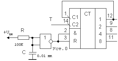 - R - роздільний вхід установки в нульовий стан (напруга низького рівня на прямому виході Q);