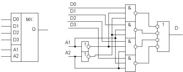 Логічний елемент - це електронний прилад, що реалізує одну з логічних функцій. В склад серій мікросхем, що розглядаються, входить велике число логічних елементів. На принциповій схемі логічний елемент зображають прямокутником, всередині якого ставиться зображення покажчика функції. Лінії з лівої сторони прямокутника показують входи, з правої - вихід елемента. На рисунку 1 зображені основні логічні елементи, що використовуються у цифрових приладах: