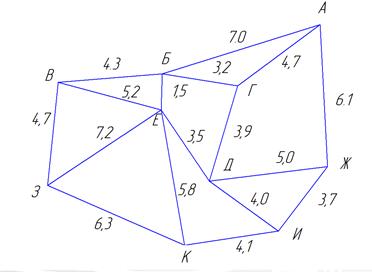 - оптимальная связывающая сеть при условии оптимизации по критерию быстроты прохождения информационного пакета (рисунок 7), с учетом удаленности пункта Ж (соответственно повышенных потерь информации) не эффективна;