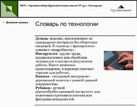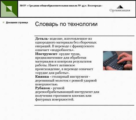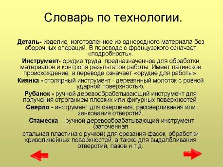 Занимаясь на уроках технологии, мы изучаем много различных терминов и понятий. Иногда не всё можно запомнить. Хорошо если есть где посмотреть. Вообще существует много справочников, словарей, энциклопедий по различным предметам. Но такой справочной литературы, именно по технологии нет. Я хочу попробовать создать электронный словарь терминов часто встречающихся на уроках технологии.