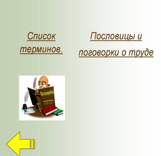 Страница подразделов, которая открывает доступ к списку терминов и разделу «Пословицы и поговорки о труде».