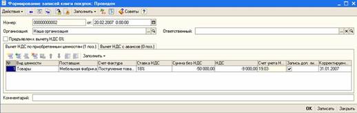 ООО «Наша организация» 15.01.2007 зарегистрировала в книге покупок счет-фактуру ЗАО «Мебельная фабрика» №1 от 15.01.2007 по приобретенному товару на сумму 59000 руб., НДС сверху 18% — 9000 руб. 20.02.2007 было обнаружено, что в счете-фактуре неверно указан ИНН поставщика, что не позволяет считать вычет правомерным.[2]