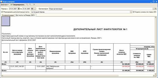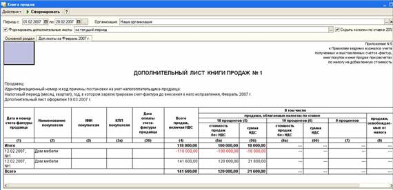 Аналогично производится исправление книги продаж. В день обнаружения ошибки необходимо заполнить дополнительный лист к книге продаж. Рассмотрим, как это осуществить на конкретном примере. Предположим, что 20февраля 2007 года Наша организация реализовала Дому мебели 10 штук диванов на сумму 118000 руб., НДС сверху. 19 марта 2007 г . выяснилось, что счет-фактура от 20 февраля сформирован с ошибками. Сумма операции должна составить 141600 руб., НДС сверху.