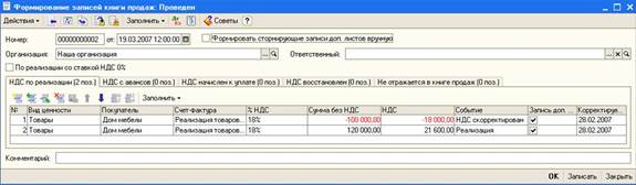 В заключение хотелось бы отметить, в случае, когда налогоплательщик вовремя не зарегистрировал счет-фактуру в книге продаж, то согласно письму Федеральной налоговой службы от 06.09.2006 № ММ-6-03/896 она должна быть отражена в дополнительном листе к книге продаж за тот налоговый период, когда этот счет-фактуру следовало зарегистрировать. Так как в этом случае сторнировать нечего, то при заполнении документа Формирование записей книги продаж вводится только одна строчка, соответствующая данным вновь зарегистрированного счета-фактуры, с установленным флагом Запись дополнительного листа. Графа Событие в данном случае принимает значение Реализация.