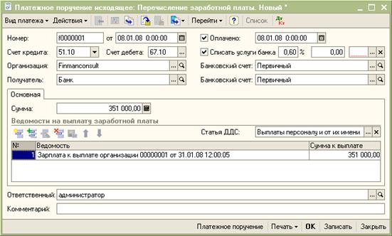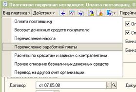 При перечислении зарплаты на счет сотрудника (например, пластиковую карточку), выбирается вид платежа «Перечисление заработной платы» и указывается расчетная ведомость в табличной части документа.