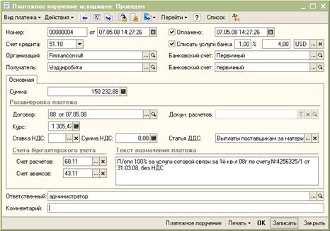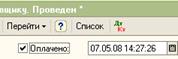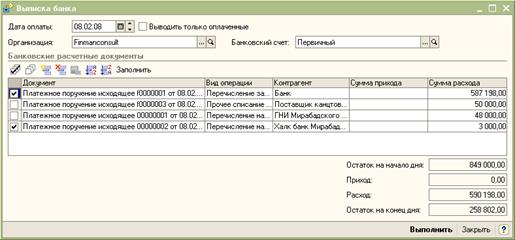 Если установить флажки у нужных документов и нажать кнопку «Выполнить », выбранные документы станут проведенными, т.е. выполнят движения по бухгалтерским счетам; в платежках автоматически установится признак Оплачено .