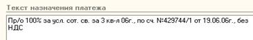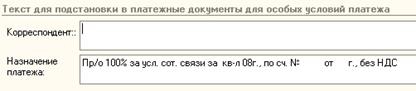 Если в банковском счете получателя в поле «Текст для подстановки в платежные документы для особых условий платежа» заранее внести детали платежа, то при выборе этого счета текст назначения платежа в поручении будет заполнен автоматически. Удобно для повторяющихся платежей, например, перечисления налогов, оплаты за сотовую связь и т.п.