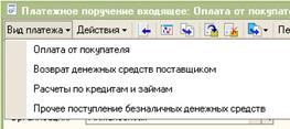 Сначала в подменю "Вид платежа" выбирается вид платежа, по которому поступают деньги. Например: оплата от покупателя, прочее поступление денежных средств.