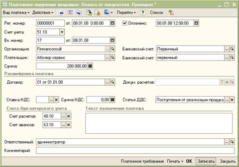 Платежное поручение входящее используется для учета оплаты от покупателей, возврата денег от поставщика, зачисления инкассации и прочих поступлений денежных средств на расчетный счет. Оно находится в меню "Банк и касса – Платежное поручение входящее".