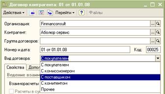 Для правильной работы с документом у контрагента вид договора должен быть "С покупателем" для покупателей и «С поставщиком» для поставщиков. Если же данный контрагент является и поставщиком, и покупателем, необходимо завести два договора.