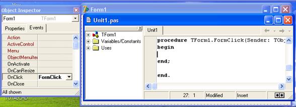 Создайте обработчик события OnClick: выберите страницу Events инспектора объектов и выполните двойной щелчок мышью в правой колонке, напротив события OnClick. На переднем плане появится окно редактирования модуля с помещенной сразу в нужное место модуля заготовкой обработчика события OnClick.