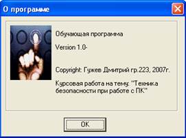 Целью курсовой работы было создание тестирующей программы по технике безопасности при работе на ПК. В процессе создания программы были изучены теоретические аспекты данной проблемы, проводился поиск подобных программ.