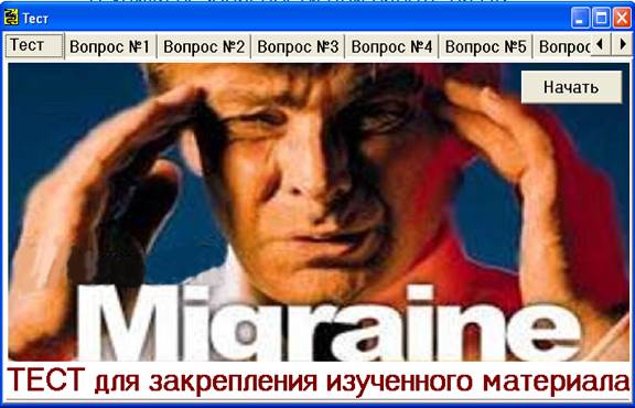 На тесте, так же как и на основной форме располагается компонент PageControl, на котором располагаются вопросы, варианты ответов и кнопка перехода к следующему вопросу. Вопросы написаны в компонентах Label. Варианты ответов – в RadioButton.