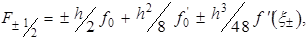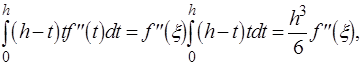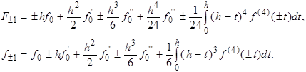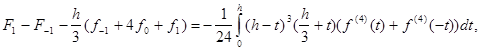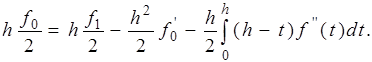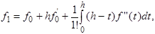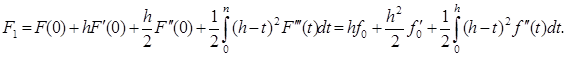 Знайдемо залишковий член, тобто похибку формули (2.2.1). Виразимо f 1 та F 1 = F ( h ) де F - функція (2.1.2), по формулі Тейлора з залишковим членом в інтегральній формі (*) :
