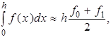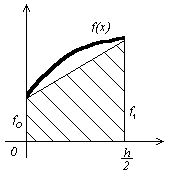 де f0 =f(0) , тобто площа криволінійної трапеції, обмеженої зверху графіком функції f(x) , апроксимується площею прямокутника, висота якого дорівнює значенню f(x) в середній точці трапеції (мал. 2.1.1).