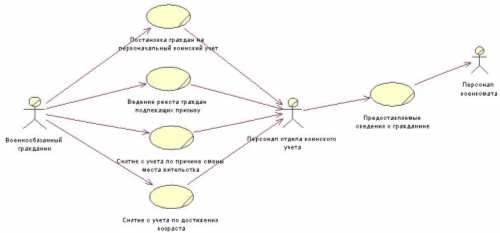 Благодаря внедрению программы для отдела воинского учета возникает более четкое разделение функций, при котором специалист вводит в систему определенный вид записей достоверных записей. Таким образом, информационная система автоматизации учета военнообязанных сводит информацию с нескольких бумажных носителей в систему в одну базу данных, обобщает ее, и в итоге программа для отдела воинского учета структурирует разрозненную информацию и позволяет увидеть ее в удобном виде. Для выполнения данной задачи была изучена внешняя и внутренняя структура администрации, собрана необходимая информация для построения диаграммы функций организации и диаграммы потоков данных, рассмотрены основные процессы.