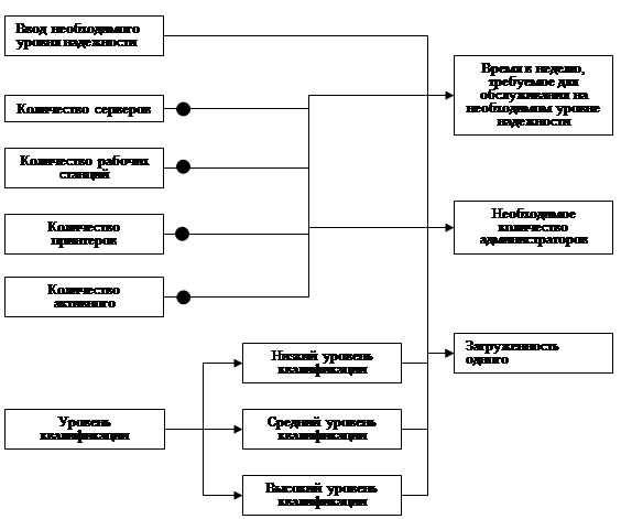 2. В местном представительстве компании «ISIT» имеется ЛВС, в которую связано определенное количество серверов, рабочих станций, присоединенная техника (например, принтера, сканеры и т.п.). Каждая единица техники требует определенных усилий от администратора для поддержания своей работоспособности. Администратор должен постоянно поддерживать необходимый уровень надежности (т.е. отсутствия сбоев в работе), например, равный 95%. При этом он хочет знать: сколько времени в неделю ему потребуется проводить в офисе компании для выполнения функций технической поддержки (с учетом экстренных выездов) для обеспечения заданного показателя надежности, необходимое количество системных администраторов. Также учитывается квалифицированность администратора.