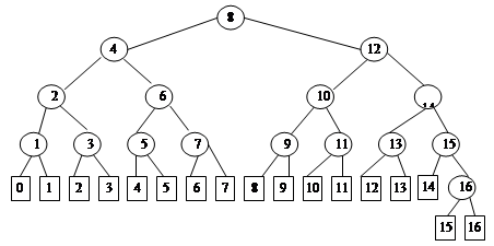 Рис. 1. Дерево порівнянь, що відповідає бінарному пошуку для N =16
