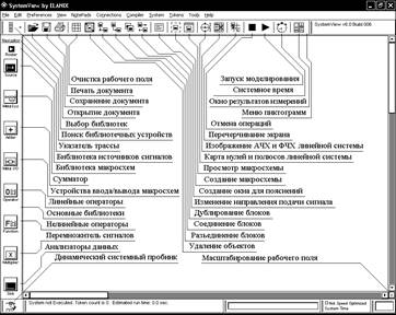 На рисунке показано окно формирования задания на анализ радиотехнической системы (в дальнейшем будем называть его системным окном). Для экономии места внутри рабочего окна дана расшифровка главных условных обозначений операций (пиктограмм).