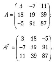 Из определения транспонированной матрицы следует, что если исходная матрица А имеет размер m × n , то транспонированная матрицаАТ имеет размер n × m .