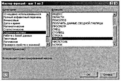 3. В появившемся диалоговом окне Мастер функций в рабочем поле Категория выберите Ссылки и массивы, а в рабочем поле Функция – имя функции ТРАНСП (рис. 1.1). После этого щелкните на кнопке ОК.