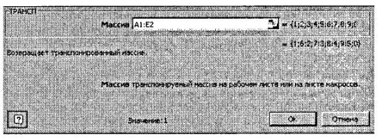 4. Появившееся диалоговое окно ТРАНСП мышью отодвиньте в сторону от исходной матрицы A1:E2 в рабочее поле Массив (указателем мыши при нажатой левой кнопке). После чего нажмите сочетание клавиш CTRL+SHIFT+ENTER (рис. 1.2).