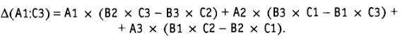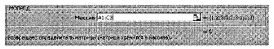 Здесь массив – это числовой массив, в котором хранится матрица с равным количеством строк и столбцов. При этом массив может быть задан как интервал ячеек, например, А1:С3; или как массив констант, например, {1;2;3;4;5;6;7;8;9}. Для массива А1:С3, состоящего из трёх строк и трёх столбцов (матрица размером 3×3), определитель вычисляется следующим образом: