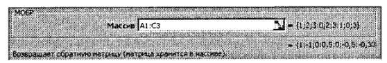2. Нажмите на панели инструментов Стандартная кнопку Вставка функции. В появившемся диалоговом окне Мастер функций в рабочем поле Категория выберите Математические, а в рабочем поле Функция – имя функции МОБР. После этого щелкните на кнопке ОК.