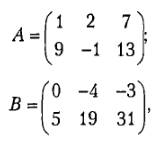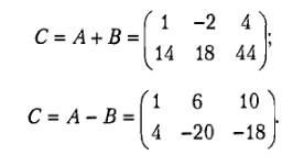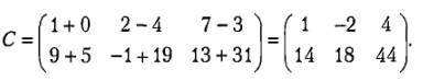 Складывать (вычитать) можно матрицы одного размера. Суммой матриц А = (aij ) и В = (bij ) размера m×n называется матрица C = A + B, элементы которой cij = aij + bij для i = 1,2, …, m; j = 1,2, …, n (то есть матрица складывается поэлементно). Например, если: