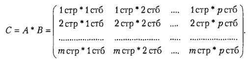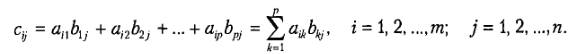 Пусть А = (aij ) m×n, B = (bij ) n×p, тогда размерность произведения А×В равна m×p. При этом матрица С называется произведением матриц А и В, если каждый её элемент cij равен сумме произведений элементов i-й строки матрицы А на соответствующие элементы j-го столбца матрицы В: