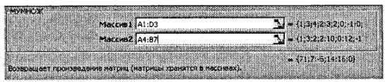 Здесь массив1 и массив2 – это перемножаемые массивы. При этом количество столбцов аргумента массив1 должно быть таким же, как количество строк аргумента массив2, и оба массива должны содержать только числа. Результатом является массив с таким же числом строк, как массив1 и с таким же числом столбцов, как массив2.