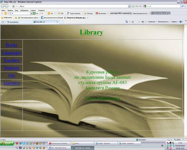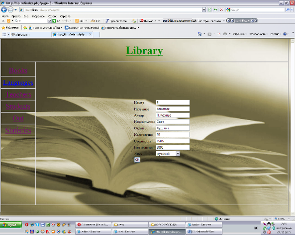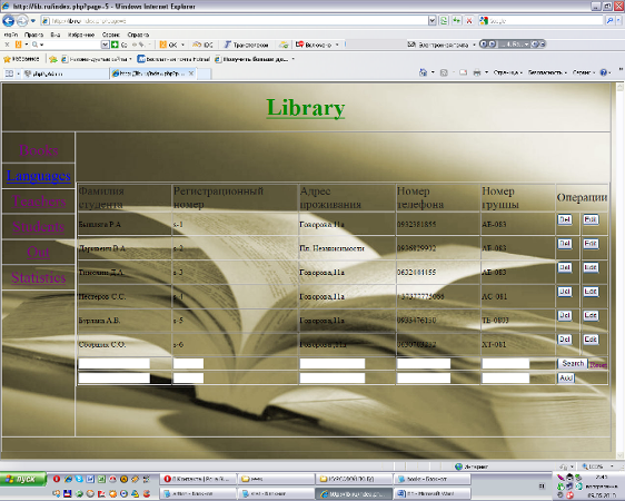 Для підключення до бази необхідно запустити сервер Denwer, в теці www знайти файл config.php і прописати правильне ім'я користувача і пароль для з'єднання з POSTGRESQL. У адресній стоці браузера ввести www.lib.ru. Далі, натискуючи на будь-яке заслання в меню зліва, ми отримуємо відповідні її назві запити. Наприклад, можна проглянути таблицю студенти: