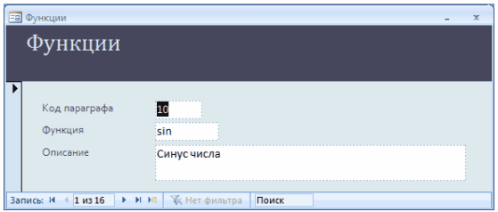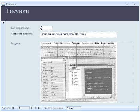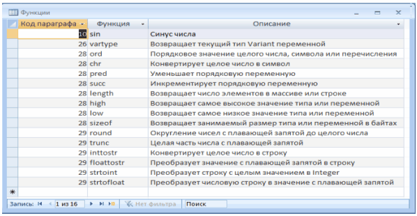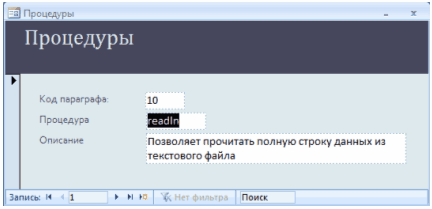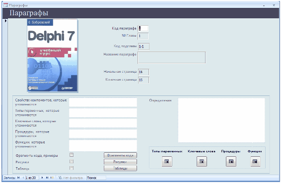 Основною формою є форма «Параграфы» (Рисунок 2.3.28), так як вона містить інформацію про вміст параграфів посібника (її назву, початкову та кінцеву сторінки, функції, ключові слова, процедури, властивості компонентів, типи змінних, що згадуються; визначення; дані про таблиці, функції та фрагменти коду, що містяться).