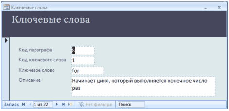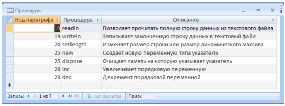 Зміст полів відображається у (6), для відкриття форм «Тип переменных», «Ключевые слова», «Процедуры», «Функции», «Фрагменти кода», «Рисунки», «Таблицы» необхідно скористуватися кнопками (7). Навігация по базі данних відбувається за допомогою навігатора (8).