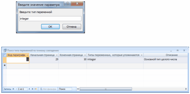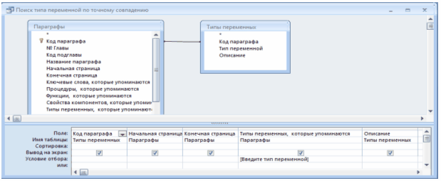 Запит «Поиск типа переменной» є запитом на відбірку, що дозволяє відобразити введений користувачем тип змінної.
